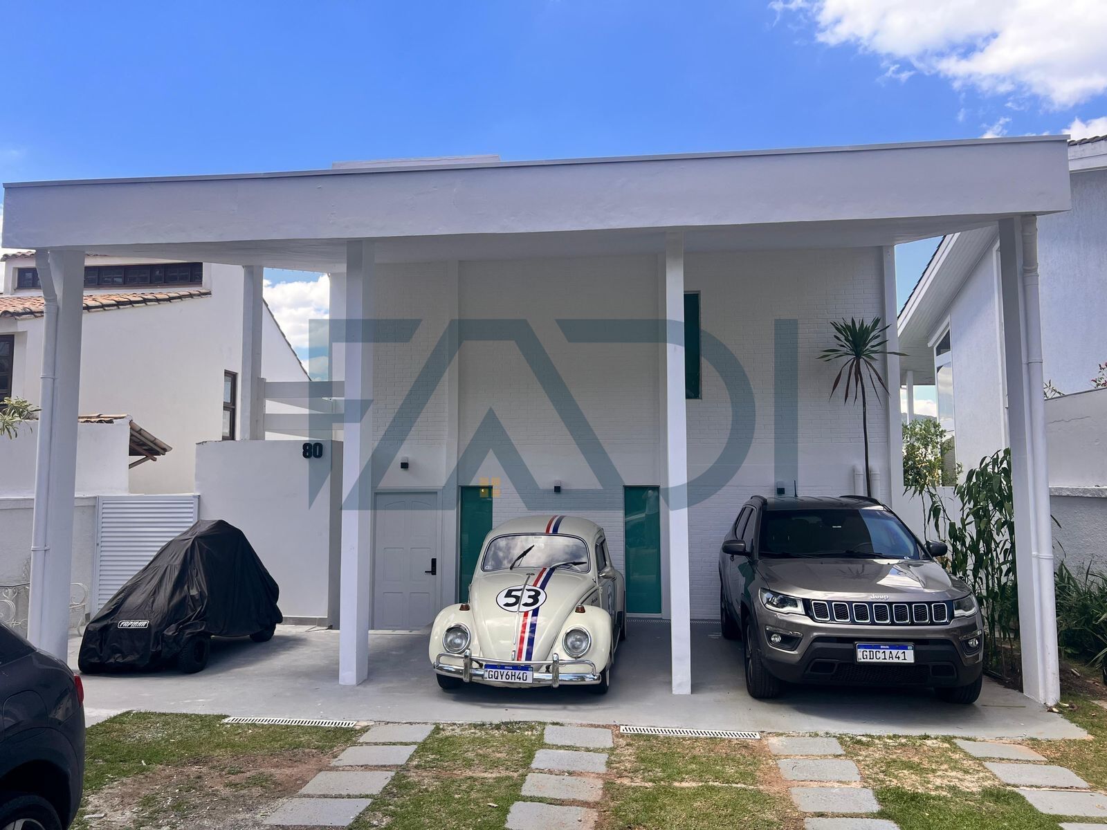 Garagem para 5 automóveis, entrada separadas; principal, área piscina e serviço.