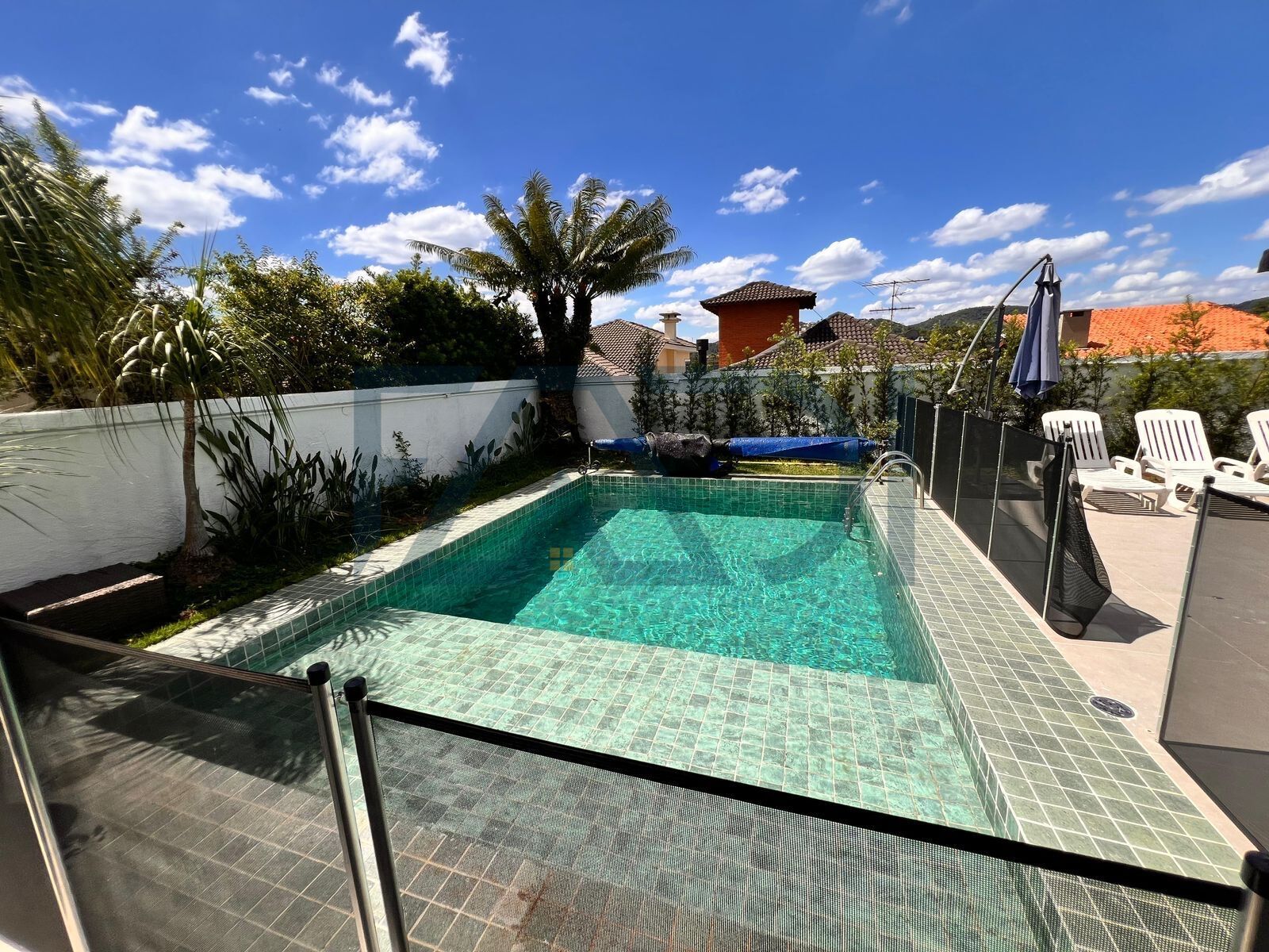 •Piscina em alvenaria e azulejada.