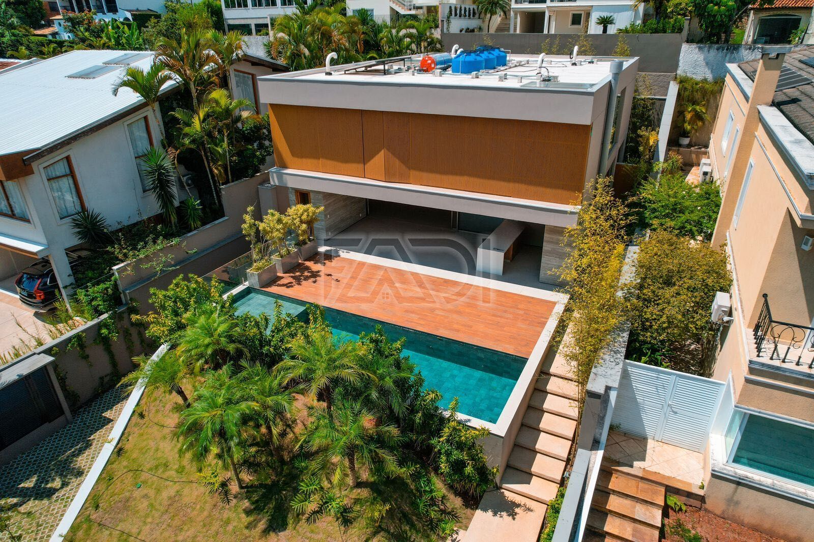 Piscina e prainha revestida em porcelanato hijau