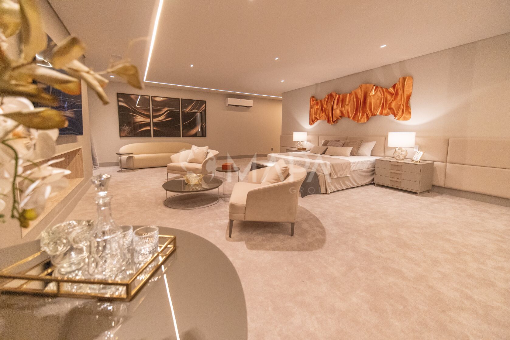 Infinity em vidro cristal e os tapetes e tecidos de alta qualidade completam um conjunto coeso e elegante.