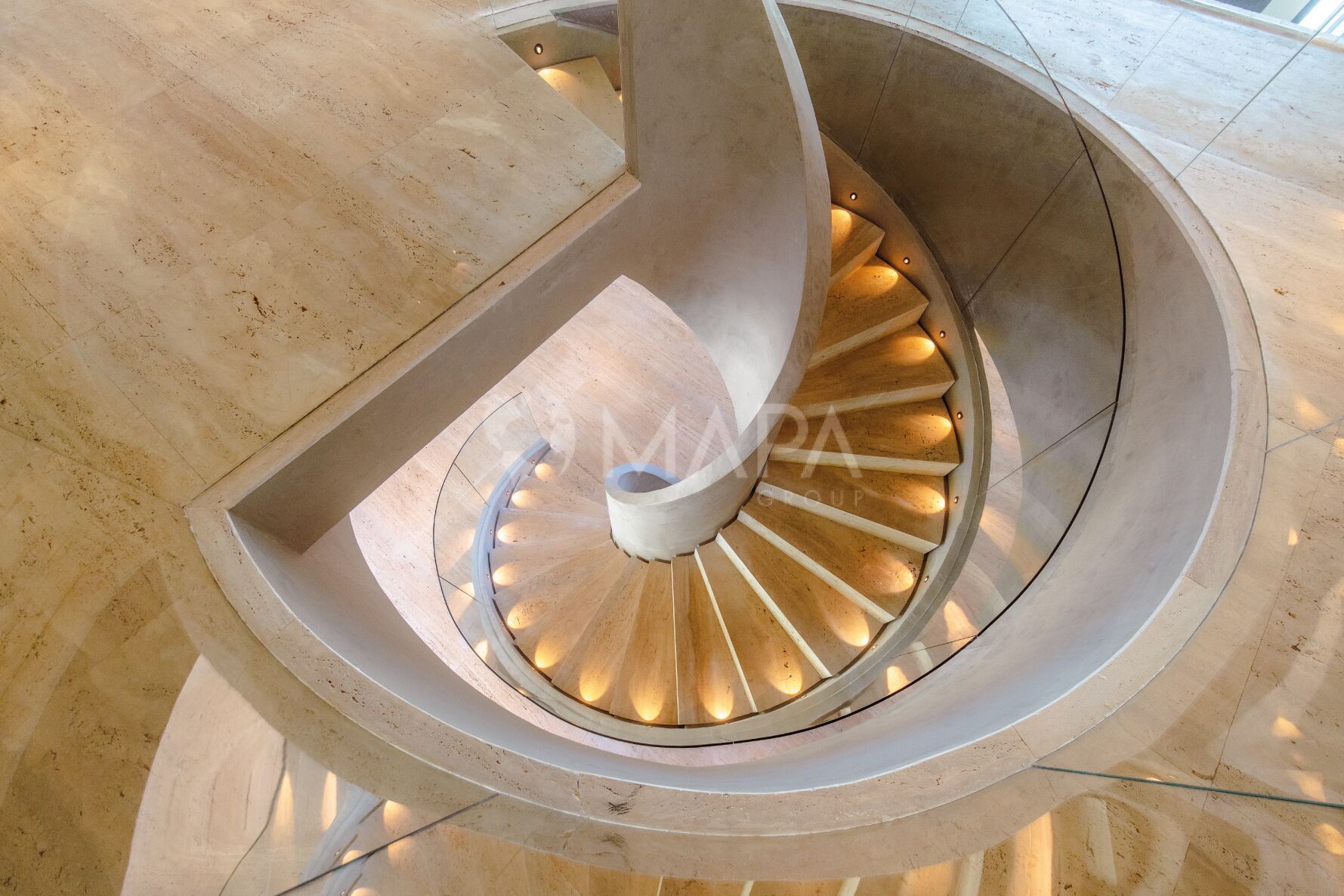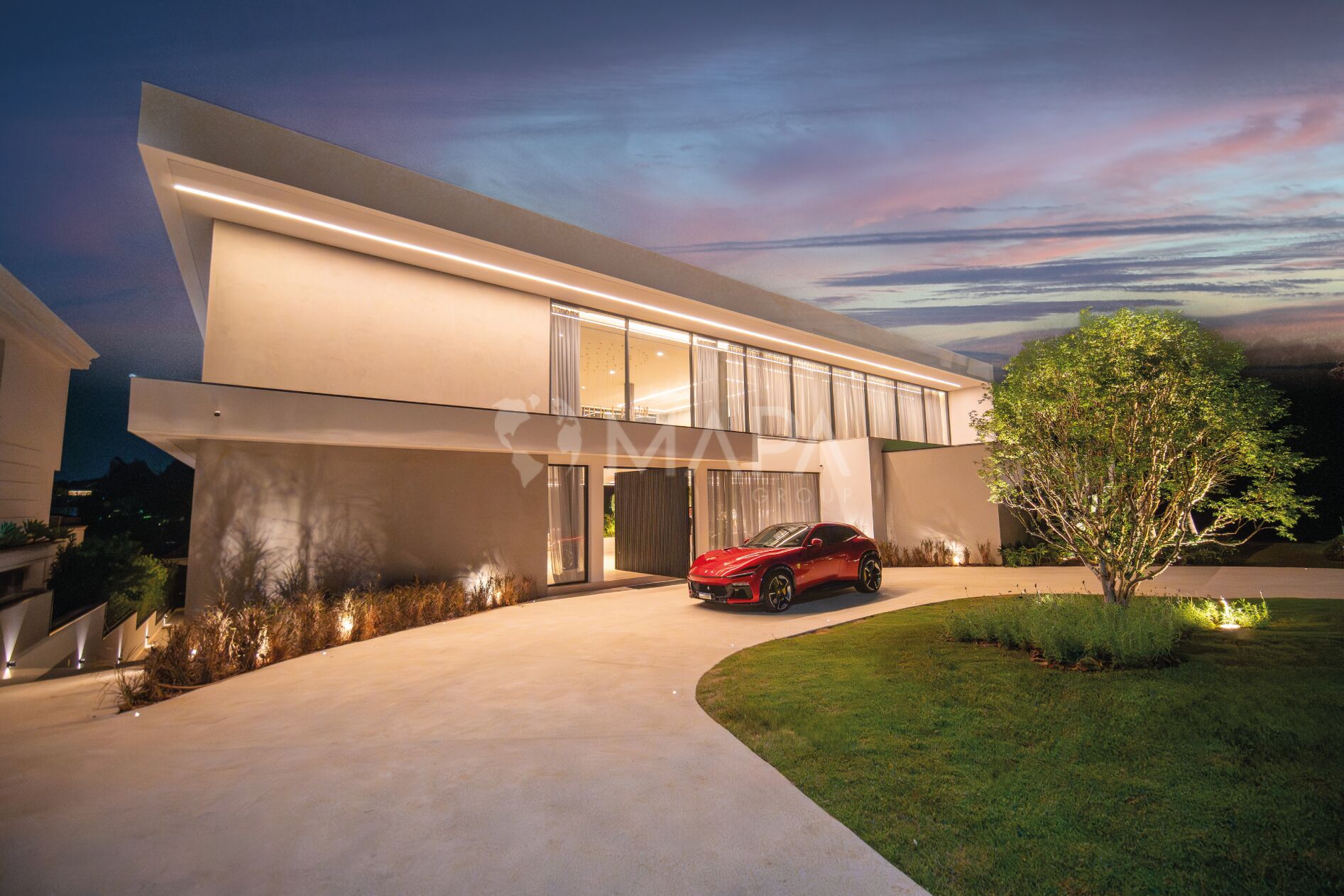 O pé-direito duplo e as esquadrias minimalistas de mais de vinte metros de largura criam uma fusão perfeita entre interior e exterior. A luz natural penetra de forma suave e constante, revelando a textura do mármore, a sofisticação dos tapetes by Kamy